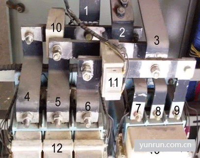 1-9為鋁排(1、4、7 為L12,2、5、8為L22,3、6、9為L32);10、11電流互感器T;12、13交流接觸器(12是原理圖中的KM3,13是原理圖中的KM2)。