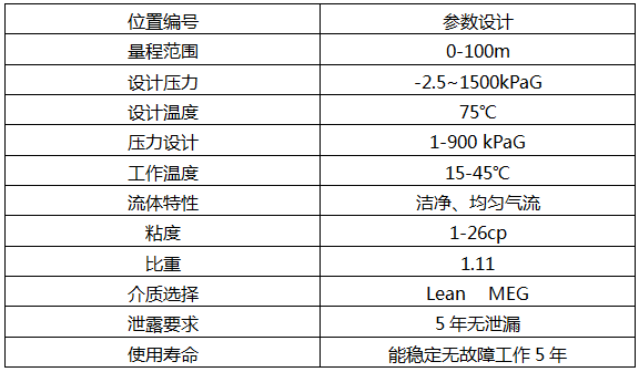 在海上平臺(tái)投入式液位變送器的設(shè)計(jì)過程中,最為重要的一項(xiàng)設(shè)計(jì)因素就是對(duì)其設(shè)計(jì)中的參數(shù)設(shè)計(jì)做出專門的分析,這是保障海上平臺(tái)投入式液位變送器應(yīng)用的重要性前提。本文在研究中,以樁腿MEG液位變送器為例對(duì)其應(yīng)用中的參數(shù)做出了專門的設(shè)計(jì)。具體的參數(shù)設(shè)計(jì)如表1所示: