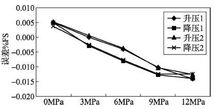 在不同的靜壓0、3、6、9、12MPa條件下對(duì)樣品的零點(diǎn)進(jìn)行了靜壓試驗(yàn)。每組分別進(jìn)行2次升壓和2次降壓試驗(yàn),測(cè)量連續(xù)進(jìn)行。單晶硅差壓變送器A和硅微電容差壓變送器B試驗(yàn)結(jié)果分別如圖2和圖3所示。
