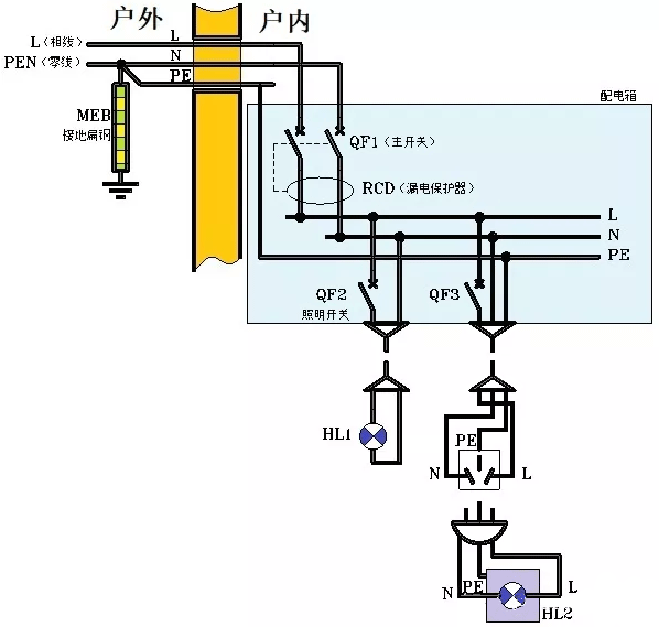 1、在戶外,配電系統(tǒng)引來一條火線(相線)和零線。其中零線做了重復(fù)接地,然后分開為中心線N和地線PE,隨同相線L一同入戶。至于火線到底是三相中的哪一條,與居家的配電和用電毫無關(guān)系,任意一條都可以。 從零線重復(fù)接地點開始往后,包括入戶之后的系統(tǒng),零線PEN就不存在了?。?!