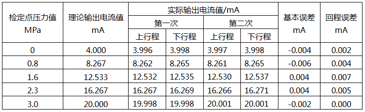 △A=|Ad1-Ad2|公式中△A為壓力變送器的回程誤差;Ad1為壓力變送器上行程檢定點(diǎn)的實(shí)際輸出值;Ad2為壓力變送器下行程檢定點(diǎn)的實(shí)際輸出值;以最大一次的回程誤差作為該檢定點(diǎn)的回程誤差記錄。