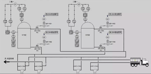 由于文章篇幅篇幅限制,只詳細(xì)介紹節(jié)點(diǎn)N01:苯乙烯儲運(yùn)。為了方便理解其流程,做了動態(tài)簡化流程圖(去除BPCS和SIS相關(guān)儀表,只留管線圖)如下所示,槽車卸料至儲罐,儲罐物料輸送至反應(yīng)車間,雙泵、雙罐、雙管線。