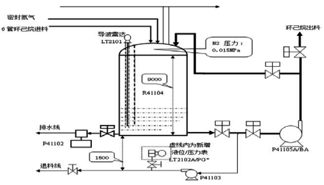 處理措施:由于容器無現(xiàn)場液位計,裝置生產需要,決定采用臨時測量手段解決過程液位測量問題,采取在容器及所附設備上取靜壓的方式滿足生產,如圖1所示??紤]容器內密封氮氣壓力恒定,停車退料泵P41103在生產時不使用,在其出口處采用現(xiàn)場差壓變送器表取壓力,在DCS系統(tǒng)上顯示液位,同時在現(xiàn)場YR-ER101差壓變送器面板上交替顯示液位與壓力。等到裝置停車改造時校正導波管,并增加導波管支撐,增加重錘配重后。再次開車確認導波雷達液位計工作正常。