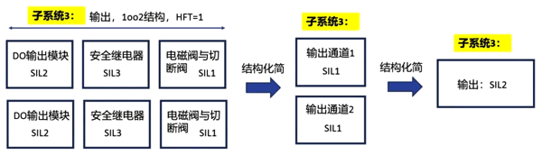 ②采用多通道子系統(tǒng)執(zhí)行安全功能的E/E/PE安全相關(guān)系統(tǒng)中,執(zhí)行整個(gè)安全功能所能達(dá)到的最高SIL等級(jí),為多個(gè)子系統(tǒng)歸并合計(jì)而成,并同時(shí)考慮HFT,來對(duì)系統(tǒng)整體SIL進(jìn)行疊加。