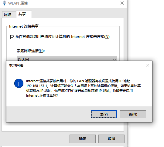 選擇完成后系統(tǒng)會提示你的有網(wǎng)卡會被重置IP地址為192.168.137.1/24,點擊是,確定即可。