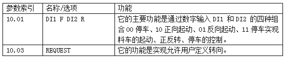 高爐上料計(jì)算機(jī)控制系統(tǒng)是由一套施耐德Quantum PLC控制的。料車的控制分為自動和手動兩種方式,自動由PLC完成,手動由操作箱完成。由于上料小車是一個(gè)重載負(fù)荷系統(tǒng),考慮到控制的安全性問題,在設(shè)計(jì)中采用通過電纜一對一信號傳輸控制,PLC輸出兩個(gè)正、反向運(yùn)行數(shù)字信號I0.1、I0.2以及手動開關(guān)信號通過控制選擇,通過必要的保護(hù)聯(lián)鎖后,連接到變頻器的DI1和DI2兩個(gè)輸入點(diǎn),完成變頻器的起動、正反轉(zhuǎn)、停車的控制。在完成了外部連線后必須對變頻器內(nèi)部相應(yīng)參數(shù)進(jìn)行設(shè)置,主要設(shè)置參數(shù)如表2: