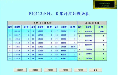 ①實時數(shù)據(jù)顯示:系統(tǒng)在工作過程中實時的顯示儀表檢測到的關(guān)鍵數(shù)據(jù)。此畫面中顯示了共計5條管線的實時數(shù)據(jù),包括瞬時流量、累計流量、壓力、差壓、溫度和儀表時鐘。