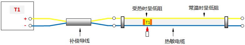 當(dāng)熱點(diǎn)探測(cè)器上另外一點(diǎn)(T2)的溫度高于(T1)點(diǎn)時(shí),該處的熱電偶導(dǎo)線之間的絕緣電阻會(huì)變的更低,從而出現(xiàn)新的“臨時(shí)”熱接點(diǎn),如圖2所示。
