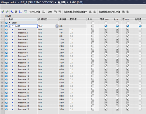 然后創(chuàng)建一個DB塊,取名為IotDB,DB號為DB1,添加一個Iot結(jié)構(gòu)體變量,如下圖所示: