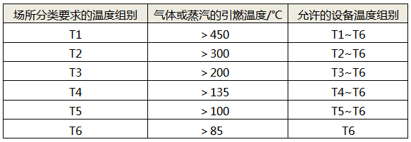 中國將爆炸性氣體按其引燃溫度分為T1-T6六個組別,見表5。