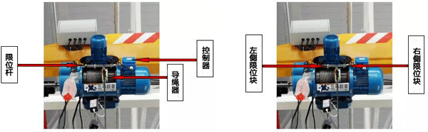 這是由斷火限位器和葫蘆鋼絲繩上的導(dǎo)繩器共同決定的:斷火限位器是雙向限位:左邊是推分常閉觸頭,右側(cè)是拉分常閉觸頭。