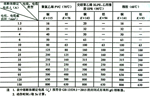 計(jì)算導(dǎo)體最小截面積;由于熔斷體的反時(shí)限特性,這種計(jì)算費(fèi)時(shí)費(fèi)力,按照《工業(yè)與民用供配電設(shè)計(jì)手冊(第四版)》的方法,在設(shè)定一些參數(shù)的條件下,計(jì)算并編制出表格,可免除麻煩的計(jì)算,只需要查表即可。接地故障的切斷電源時(shí)間,除部分末端回路外,對于TN系統(tǒng)不應(yīng)超過5s。而經(jīng)研究分析,短路持續(xù)時(shí)間t在0.1-5s之間,以t=5s時(shí)對導(dǎo)體截面積(S)的要求最高,因此以t=5s為計(jì)算前提既簡單又保險(xiǎn)、可靠。按t=5s時(shí)計(jì)算,并符合GB13539.1-2015《低壓熔斷器 第1部分:基本要求》中封閉式限流熔斷體的gG熔斷器(額定電流Ia≥16A)規(guī)定的弧前時(shí)間的門限值[5s動作的最大電流Imax(5s)]和時(shí)間-電流特性,計(jì)算出絕緣電線、電纜的不同型和不同截面積(S)時(shí)熔斷體額定電流(In)的最大允許值,列于表1。
