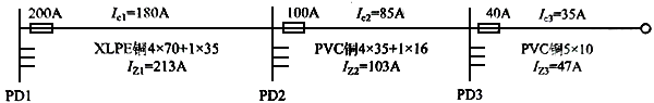 解:按照計(jì)算電流選擇的三段配電線路的類型和截面積,查表1可知,其短路保護(hù)的熔斷體額定電流(In)最大允許值分別為500、250、80A,比按過負(fù)荷保護(hù)要求選擇的熔斷體額定電流值200、100、40A(標(biāo)注在圖1中)大得多,完全滿足短路保護(hù)要求。