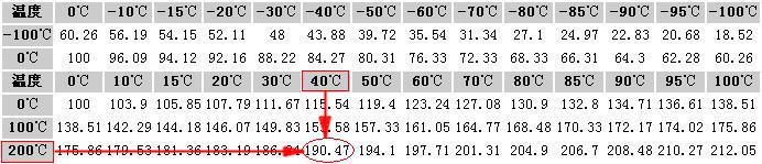 我們以查詢(xún)Pt100鉑電阻240℃時(shí)溫度值對(duì)應(yīng)的電阻值為例:基本方法與前面一致。首先在第一列上部找到200℃位置,再在列中找到40℃位置,兩個(gè)位置的和200+40=240℃,這兩個(gè)位置在表格中交叉點(diǎn)的數(shù)據(jù)為190.47歐姆,那表明溫度240℃對(duì)應(yīng)的電阻值為190.47歐姆,查表完成。