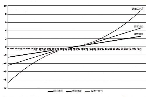 圖1 雙增益PID在誤差接近于零的時(shí)候?yàn)榈驮鲆?斜率較低),在誤差較大的時(shí)候?yàn)楦咴鲆?斜率較高);誤差二次方有類似的特征,但增益變化是連續(xù)的