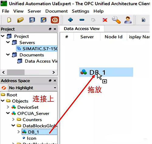 Step 6: OPC UA服務器已連接上,并顯示在AddressSpace中。找到DB_1并將其拖放入右側(cè)的Data Access View中。