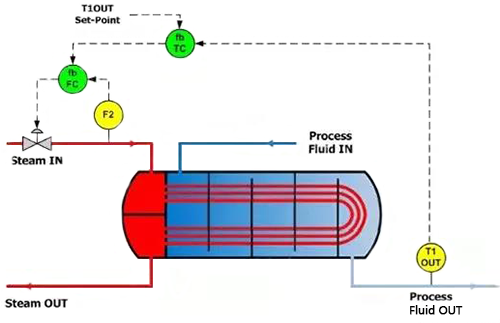 加熱是通過在管側(cè)通入蒸汽來實(shí)現(xiàn)的,通過管道的蒸汽越多,傳遞給過程流體的熱量就越多,反之亦然。蒸汽流量F2(操縱變量)的控制是通過調(diào)節(jié)安裝在蒸汽入口側(cè)的調(diào)節(jié)閥來實(shí)現(xiàn)的。