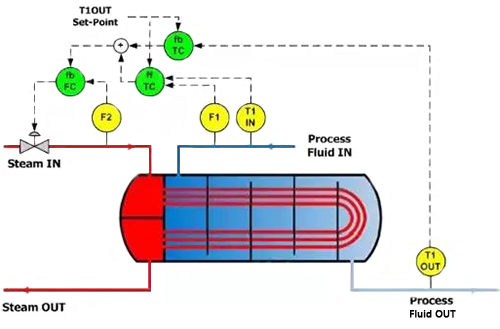 為了便于說明,考慮圖中所示的換熱器,殼程流體是需要加熱到某個溫度設(shè)定點(diǎn)的過程流體,該結(jié)果溫度是在換熱器T1的出口處測量的-OUT(受控變量)。