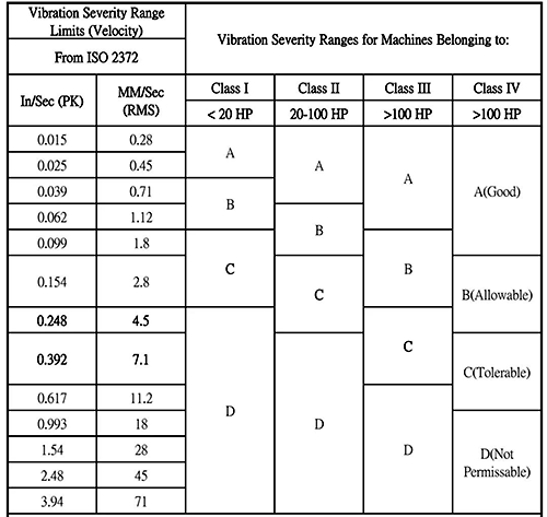 在表格中不難發(fā)現(xiàn),左邊列出了振動(dòng)烈度的單位,包括速度有效值和位移峰值。
