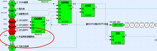 系統(tǒng)轉(zhuǎn)速超過3090rpm,在"允許103%動(dòng)作"信號(hào)下,發(fā)出OPC動(dòng)作信號(hào),當(dāng)轉(zhuǎn)速降至3060rpm以下,動(dòng)作信號(hào)消失。