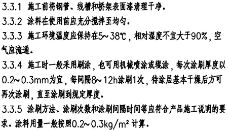 3.5.10 金屬鋼管、線槽、橋架的防火涂料的涂刷長(zhǎng)度與電纜的防火涂料的涂刷長(zhǎng)度要求是一致的。