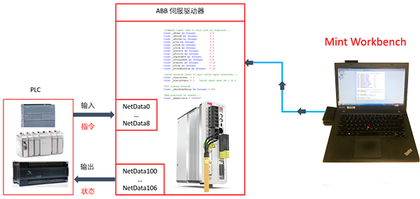 在驅(qū)動器內(nèi)下載ABB標(biāo)準(zhǔn)的GDI程序。標(biāo)準(zhǔn)GDI程序?yàn)樗欧?qū)動器定義了一系列輸入和輸出寄存器(NetData)。上位PLC可通過對NetData的讀寫,實(shí)現(xiàn)對ABB伺服的控制。