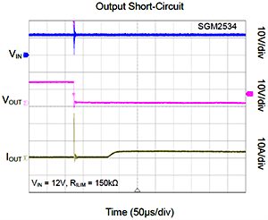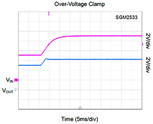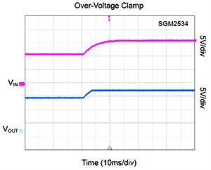 4、SGM2533A/B為5V系統(tǒng)提供過壓鉗位保護(hù)功能,SGM2534A/B為12V系統(tǒng)提供過壓鉗位保護(hù)功能。當(dāng)系統(tǒng)輸入過壓時,SGM2533A/B和SGM2534A/B分別將輸出電壓鉗位至6.1V和15V,保證下游設(shè)備工作在安全電壓范圍內(nèi)。當(dāng)芯片長時間工作在輸入過壓工況中,帶載能力會因為熱損耗的增加觸發(fā)過熱保護(hù)而受到限制,最終切斷芯片的輸出來避免對后級電路造成潛在的電壓沖擊。
