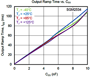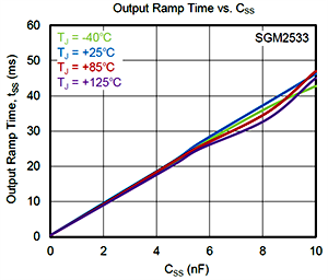 3、對于不同的工況,可以通過一個外接CSS電容來設(shè)定需要的輸出電壓斜率以減少浪涌電流,保護(hù)下游大電流敏感器件并抑制輸入端電壓的波動。