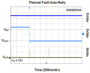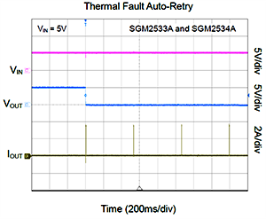 5、根據(jù)客戶系統(tǒng)的不同應(yīng)用需求,SGM2533/SGM2534提供自恢復(fù)和熱關(guān)斷兩個版本。