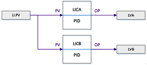 同一個(gè)液位組態(tài)成兩個(gè)單獨(dú)的控制回路。這種方式任何一個(gè)控制回路都可以使用一個(gè)調(diào)節(jié)閥投自動(dòng)。如果兩個(gè)控制回路以同樣設(shè)定值同時(shí)控制時(shí),由于有多余的自由度長(zhǎng)時(shí)間運(yùn)行下來(lái),兩個(gè)調(diào)節(jié)閥開(kāi)度由于有多解,會(huì)造成兩個(gè)閥位不可避免的開(kāi)度偏差很大的情況。如果采用如上圖所示的兩個(gè)控制回路使用兩個(gè)設(shè)定值的方法也不能正常工作。大家可以想象一下如果LICA的設(shè)定值為40,LICB的設(shè)定值為41,此時(shí)的測(cè)量值LI.PV恰好等于40.5的場(chǎng)景,此時(shí)肯定一個(gè)控制器打開(kāi)調(diào)節(jié)閥,另一個(gè)控制器關(guān)閉調(diào)節(jié)閥,結(jié)果必然一個(gè)調(diào)節(jié)閥全開(kāi)或全關(guān),只有一個(gè)調(diào)節(jié)閥生效。