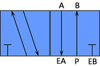 五通閥,一個(gè)進(jìn)氣孔(P)和兩個(gè)出氣(A、B)和兩個(gè)排氣孔(EA、EB)。適合控制氣缸往復(fù)運(yùn)動(dòng)。也是最常用的電磁閥。