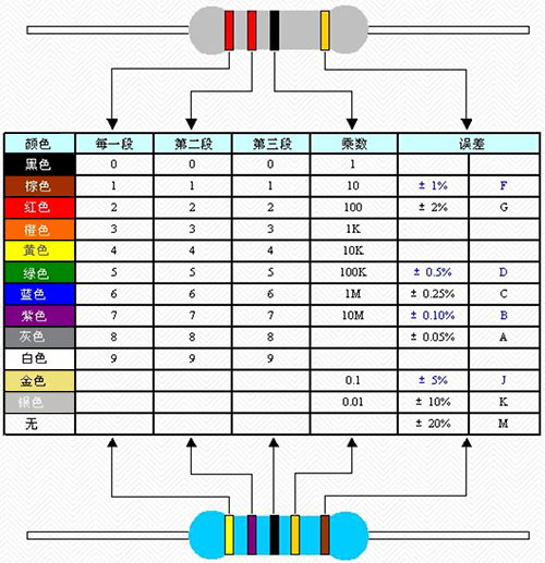 快速讀數(shù)首先需要先記住色環(huán)顏色代表的數(shù)字:棕色代表數(shù)字1;紅色代表數(shù)字2;橙色代表數(shù)字3;黃色代表數(shù)子4;綠色代表數(shù)字5;藍(lán)色代表數(shù)字6;紫色代表數(shù)字7;灰色代表數(shù)字8;白色代表數(shù)字9;黑色代表數(shù)字0;金、銀色表示誤差。金色偏差范圍在±5%。銀色在±10%。大家可以記住色環(huán)電阻識(shí)別口訣:棕一紅二橙是三,四黃五綠六為藍(lán),七紫八灰九對(duì)白,黑是零,金五銀十表誤差?;蛘邔?duì)照下面的表格。
