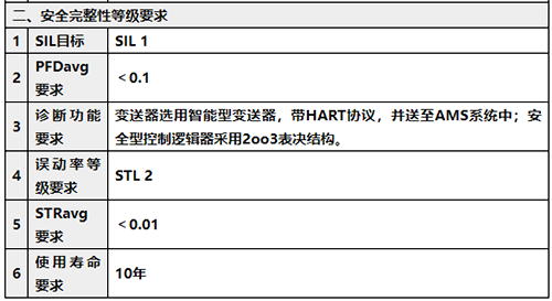 安全要求規(guī)格書一般包括通用性要求、安全功能要求及完全完整性要求。SIS通用要求包括的設(shè)計(jì)標(biāo)準(zhǔn)、運(yùn)行環(huán)境、EMI/RFI(電磁干擾/射頻干擾)要求、EMC(電磁兼容性)要求等,這些內(nèi)容可從SIS技術(shù)規(guī)格書中獲取。SIS需根據(jù)相應(yīng)的標(biāo)準(zhǔn)規(guī)范進(jìn)行設(shè)計(jì),在合適的環(huán)境中運(yùn)行,避免電磁干擾影響安全功能的執(zhí)行。SIF的通用要求包括運(yùn)行模式要求、失效模式、MTTR/MRT要求、使用壽命要求、診斷功能要求等,這些是每個(gè)SIF的共性部分。安全功能要求是描述SIF回路執(zhí)行什么樣的安全功能,這部分內(nèi)容做為SIS設(shè)計(jì)的輸入條件。安全完整性等級(jí)要求是描述SIF回路如何更好的執(zhí)行安全功能,對(duì)SIF回路的SIL等級(jí)、目標(biāo)失效量、周期性檢測(cè)等提出要求,這部分內(nèi)容做為SIL驗(yàn)算的輸入條件之一。