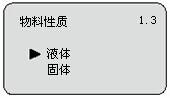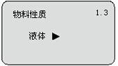 物料性質(zhì)菜單用于選擇物料為固體或液體,從而進(jìn)一步確定物料的其它一些影響測(cè)量的性質(zhì)。當(dāng)液晶顯示菜單號(hào)為1.2時(shí),按
