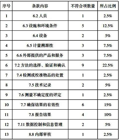 CNAS-CL01:2018《檢測(cè)和校準(zhǔn)實(shí)驗(yàn)室能力認(rèn)可準(zhǔn)則》包括五方面要求共計(jì)35個(gè)要素。為更加規(guī)范有效地實(shí)施糾正措施,本文統(tǒng)計(jì)分析了2013年至2020年本院在中國(guó)合格評(píng)定國(guó)家認(rèn)可委員會(huì)(CNAS)監(jiān)督評(píng)審、擴(kuò)項(xiàng)評(píng)審和復(fù)評(píng)審中的不符合項(xiàng)共計(jì)40項(xiàng)(見(jiàn)下表),主要涉及資源要求、過(guò)程要求、管理體系要求三個(gè)方面的13個(gè)要素條款。