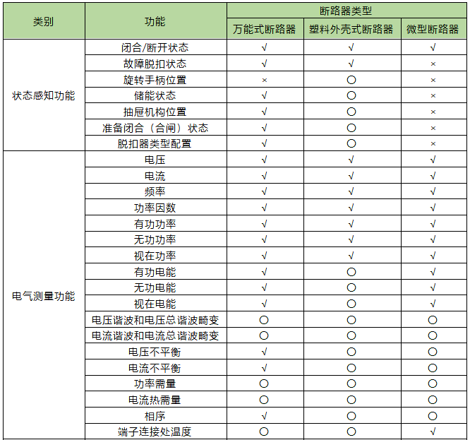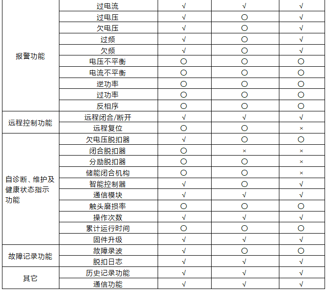 表中智能斷路器的“遠(yuǎn)程復(fù)位”功能需謹(jǐn)慎!當(dāng)過(guò)負(fù)荷或短路跳閘后不建議遠(yuǎn)程復(fù)位,需人工現(xiàn)場(chǎng)排查故障后手動(dòng)復(fù)位;萬(wàn)能式斷路器的“電壓和電流不平衡”功能不需增加成本即可實(shí)現(xiàn),故作為基本功能。