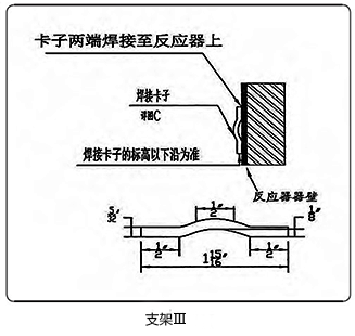 ③支架III:每床層8個,支架II間均勻分布,用于熱電偶固定。這種方案只要前期設(shè)計(jì)準(zhǔn)確,安裝是比較方便靈活的,且預(yù)埋件體積小,數(shù)量少,可有效減小焊接對反應(yīng)器器壁堆焊層的影響。