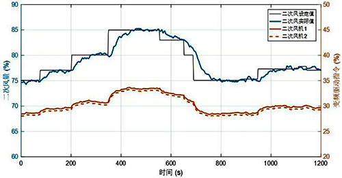 ADRC參數(shù)整定公式首先在多個仿真算例進行了驗證,包括延遲對象、非最小相位對象、震蕩環(huán)節(jié)的對象,甚至是100階的高階對象。之后被用于水箱水位控制的實驗中,最終被應(yīng)用于實際運行的火電機組中,包括二次風(fēng)、過熱汽溫等回路。圖3、圖4所示為循環(huán)流化床機組二次風(fēng)回路的應(yīng)用效果,表中為應(yīng)用指標對比。實際使用該整定公式非常容易,初次計算的ADRC參數(shù)就可以保證投切后系統(tǒng)穩(wěn)定過渡,無震蕩發(fā)散,并且效果比PID的控制效果好很多。