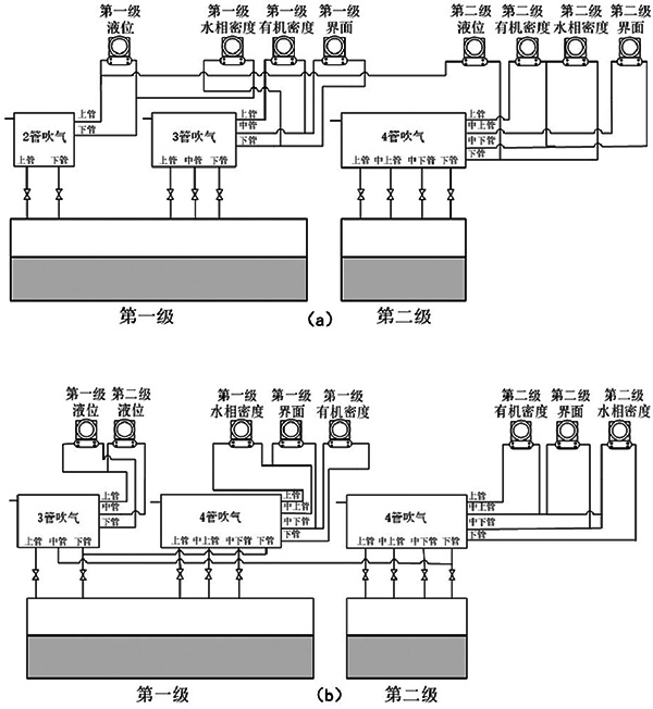 在建后處理項(xiàng)目中的混合澄清槽需檢測兩級相關(guān)參數(shù)的,每級檢測的參數(shù)均為水相密度、有機(jī)相密度、液位和界面,采用吹氣測量法進(jìn)行檢測。測量裝置由吹氣管、吹掃裝置和差壓變送器3部分構(gòu)成,檢測到的差壓信號送至控制系統(tǒng)運(yùn)算后顯示。但是,其檢測系統(tǒng)的設(shè)計(jì)有兩種,如圖2所示。一種是由二管、三管和四管3個(gè)分體式吹氣儀表組合使用方式,另一種是由三管、四管和四管的分體式吹氣儀表組合使用方式,都能夠滿足工藝參數(shù)的測量。