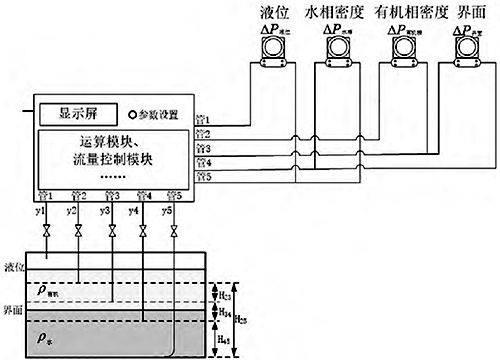 當(dāng)液位高于y2管,界面低于y3管,即y2管與y3管末端均浸入有機(jī)相中,此時(shí)可測得有機(jī)相密度ρ有機(jī)=?P有機(jī)/(H23×g)。當(dāng)界面高于y4管時(shí),ρ水=?P水相/(H45×g)。