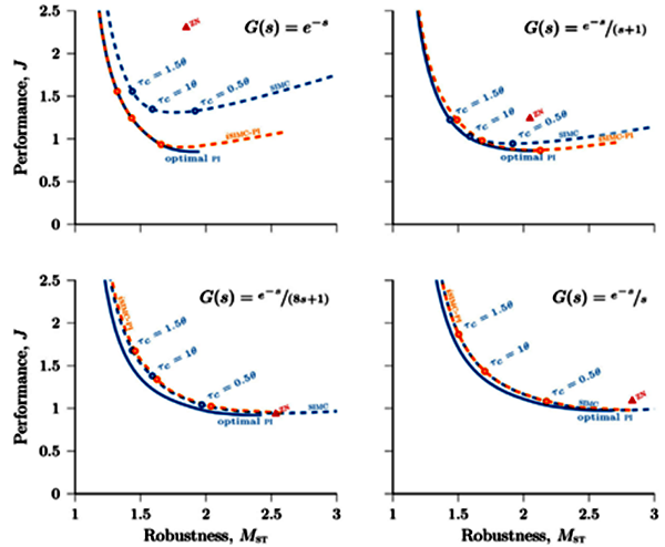 純滯后對(duì)象可以通過(guò)算法改進(jìn)改善性能,但是純滯后對(duì)象實(shí)際應(yīng)用中并不多所以對(duì)SIMC-PI進(jìn)行改進(jìn)意義不大。雖然使用微分能帶來(lái)性能和魯棒性的改進(jìn),但是增加微分會(huì)顯著增加整定的難度而且微分對(duì)噪聲非常敏感,這些改進(jìn)是以增加輸入使用為代價(jià)的,以響應(yīng)測(cè)量噪聲、輸出干擾和設(shè)定值變化。SIMC規(guī)則可能是最佳選擇。Skogestad教授針對(duì)更復(fù)雜的模型通過(guò)使用有效純滯后來(lái)近似其余的高階動(dòng)態(tài)來(lái)處理。