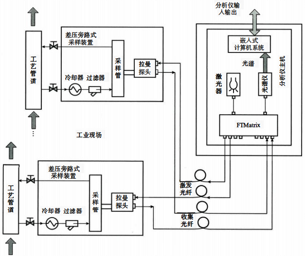 整套拉曼光譜在線分析儀如圖所示,分為現(xiàn)場(chǎng)采樣裝置和分析儀主機(jī)兩部分,中間利用光纖進(jìn)行激光與拉曼信號(hào)的遠(yuǎn)距離傳送?,F(xiàn)場(chǎng)采樣柜為本安結(jié)構(gòu),無(wú)須供電,直接放置在工藝管線旁。分析儀主機(jī)包括激光器、光譜儀、光路變換矩陣以及一套嵌入式計(jì)算機(jī)系統(tǒng),主要完成光譜采樣的自動(dòng)控制、光譜數(shù)據(jù)的獲取與處理、分析模型計(jì)算及數(shù)據(jù)通信傳輸?shù)裙δ堋?/span>分析結(jié)果的輸出除標(biāo)準(zhǔn)的Modbus數(shù)字通信外,還包括4-20mA電流輸出(可選)。
