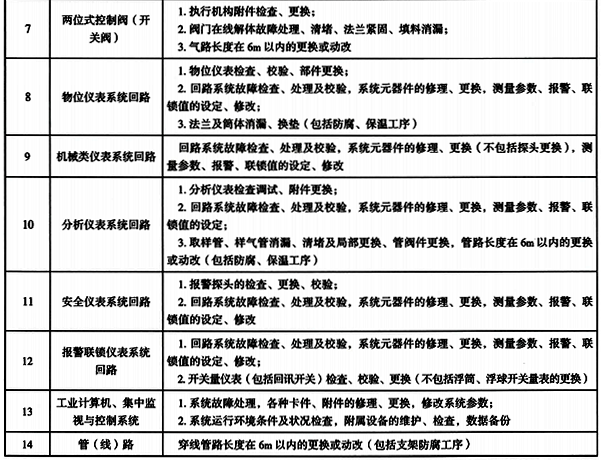 故障處理指自動(dòng)化控制與儀表各種故障原因查找和處理工作(如設(shè)備、管路密封點(diǎn)出現(xiàn)跑、冒、滴、漏等故障)。故障處理工作范圍與原定額對(duì)比,取消了溫度儀表法蘭消漏、節(jié)流裝置消漏、機(jī)械量?jī)x表探頭更換三類故障,單列開(kāi)關(guān)閥法蘭消漏、氣缸更換故障項(xiàng)目。故障處理的工作內(nèi)容見(jiàn)表1。