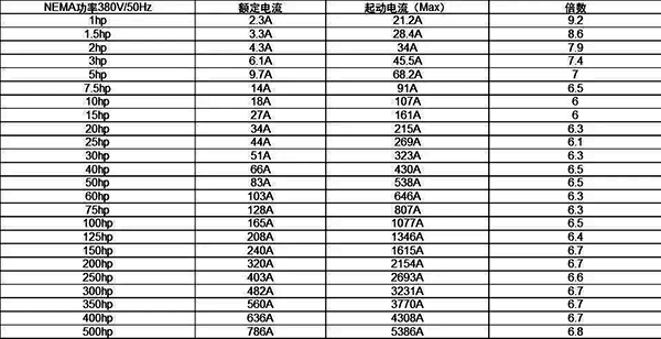 如果將上面表格做成圖表格式,會發(fā)現最大起動/堵轉電流的范圍為6~9.2倍額定電流(1hp=0.75kW),功率越小起動電流越大。電動機起動電流大小和起動時間對于選擇電動機保護斷路器或熱繼電器的脫扣級別非常重要,GB14048.4標準中脫扣級別規(guī)定了電動機保護斷路器或熱繼電器在7.2倍整定電流下的動作時間。
