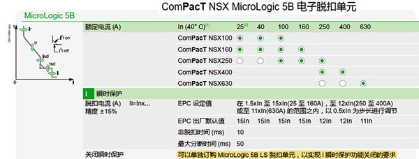 瞬時保護可以關閉的塑殼斷路器,例如NSX塑殼斷路器5B電子脫扣器,其瞬時保護確實可以關閉,但不能認為它和框架斷路器一樣,當瞬時保護關閉、短延時保護打開時,如果短路電流遠遠超過短延時保護設定值10Ir(例如短路電流達到Icu級別),框架斷路器會延時0.4s后動作,但是塑殼斷路器會立即動作。