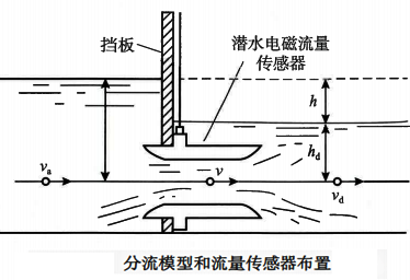 潛水式電磁流量計工作時,液體淹沒孔口,孔口流出速度與孔口在自由表面下的沉沒深度無關,僅取決于上下游的水位差。也就是說,流量測量值與流量傳感器(或分流模型)安裝位置無關,但要求盡可能低,使之運行過程中始終處于淹沒流狀態(tài)。通過流量傳感器的流速一般為2~3.5m/s,上游抬高水位100~300mm。