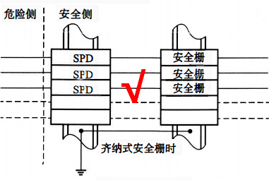 信號(hào)浪涌保護(hù)器的接地線與被保護(hù)設(shè)備的外殼接地端之間需用跨接線連接,并在SPD接地點(diǎn)處連接到大地。非本安信號(hào)SPD在機(jī)柜內(nèi)的布線如下圖所示。