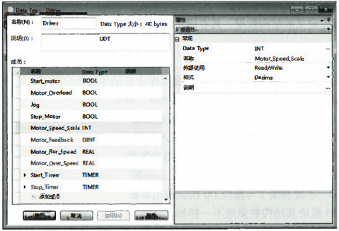 用戶自定義數(shù)據(jù)結(jié)構(gòu)。用戶自定義數(shù)據(jù)結(jié)構(gòu)(UDF)是在編程時(shí)為了某一控制任務(wù)組織相關(guān)數(shù)據(jù)而建立的數(shù)據(jù)結(jié)構(gòu),以便于數(shù)據(jù)的查找、監(jiān)視和傳輸?shù)取T诮?shù)據(jù)結(jié)構(gòu)的過程中,數(shù)據(jù)元素的定義順序與存儲(chǔ)器空間的占用有關(guān)。BOOL類型占1位,每建立一個(gè)BOOL元素,都會(huì)存放在剩余的空間上。如果空間不夠,再劃出新的32位字的空間。同理,SINT類型占8位,每建立一個(gè)SINT元素,都會(huì)存放在剩余的空間上。如果空間不夠,再劃出新的32位字的空間。其他類型以此類推。一個(gè)完整的用戶自定義數(shù)據(jù)結(jié)構(gòu)UDF的大小一定是32位的整數(shù)倍。