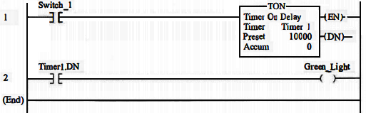梯形圖一般由2條母線和指令構(gòu)成的梯級(Rung)或階梯組成,每條梯級包括輸入指令和輸出指令。輸入指令和左母線相接,輸 出指令最后連接右母線。梯形圖以結(jié)束語句(END)表示程序結(jié)束。典型的梯形圖如圖所示,這是一個延時通邏輯,當(dāng)開關(guān)Swith_1閉合后10s,綠燈Green_Light亮。