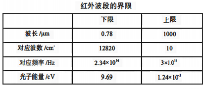 如用電子伏特eV作為光子能量單位,則按以上關(guān)系式計(jì)算,紅外波段的界限見表。